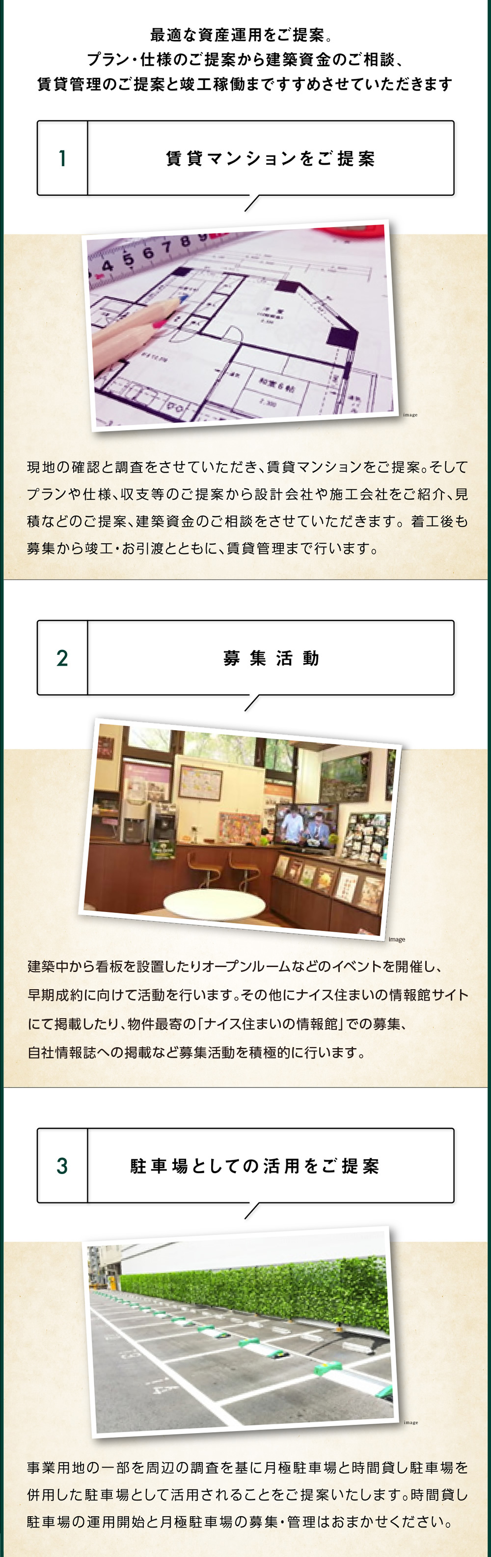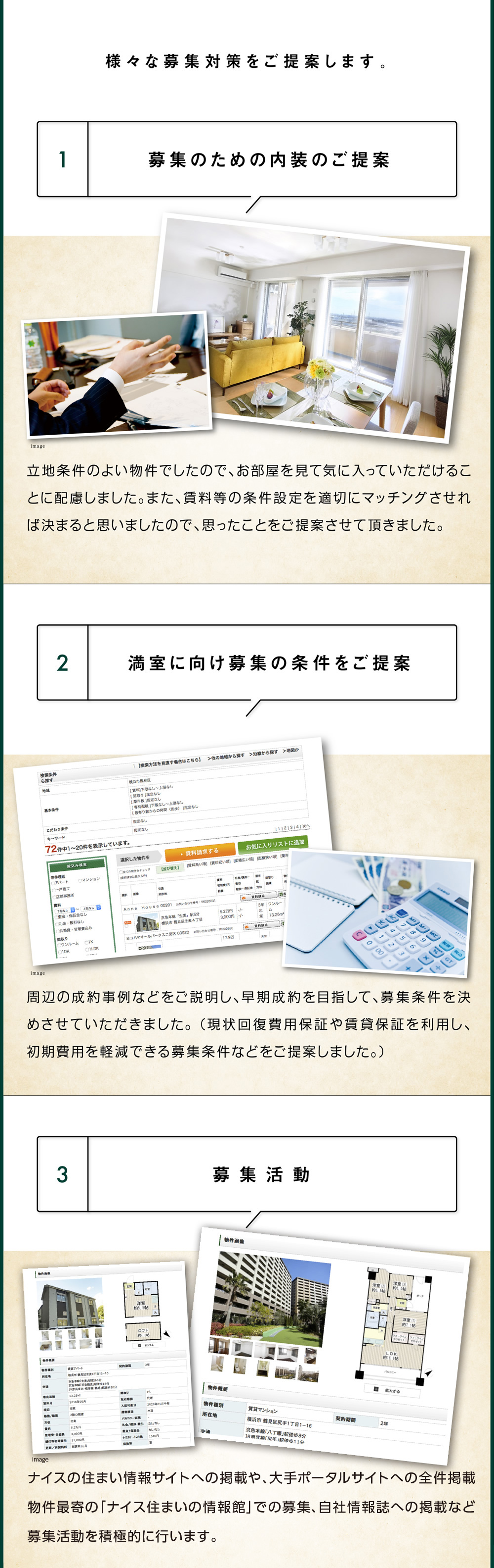 また、直近の賃貸動向、相場変遷も理解しており、お客様のいつから貸したい等のご賃貸事情とマーケットの状況を鑑みた最適な販売戦略を立案させていただきます。
